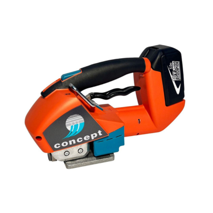 Handheld semi-automatic cordless taping tool for polyester and polypropylene tape.