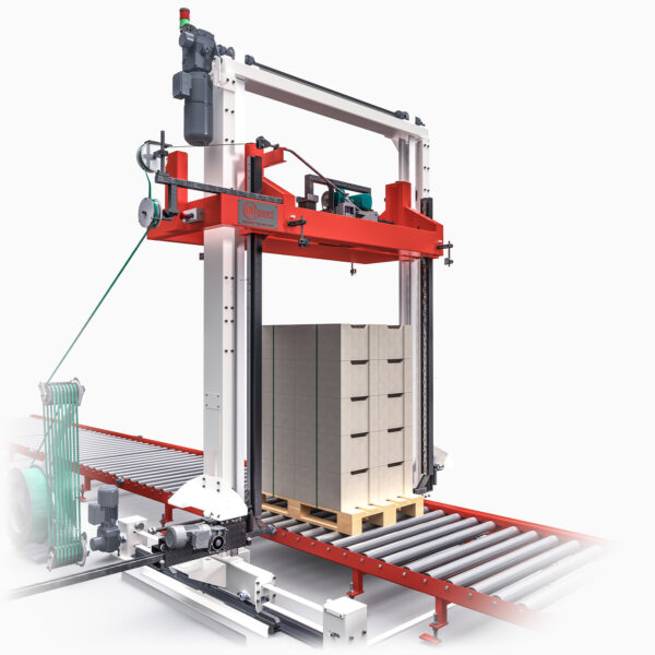 Pre páskovanie paletizovaných zásielok s týmto páskovacím strojom je potrebné použiť reťazové dopravníky, po ktorých palety vstupujú do stroja priečne. Riadiaci systém páskovacieho stroja ovláda posun zásielok na dopravníku pre páskovanie v požadovanom bode.