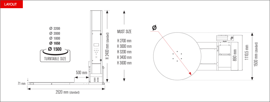 Ovinovací stroj Easy Wrap 2000 A má priemer točne 1500 mm (štandard) a dokáže spracovať produkty s rozmermi d 800 x š 1200 x v 2200 mm s maximálnou hmotnosťou dosky 1500 kg. Okrem možnosti nastavenia počtu otočení fólie na spodnej a hornej strane palety je možné upraviť aj mäkký štart stola pomocou invertoru. Balička paliet je vybavená PLC Siemens a 7.2 farebným dotykovým displejom.