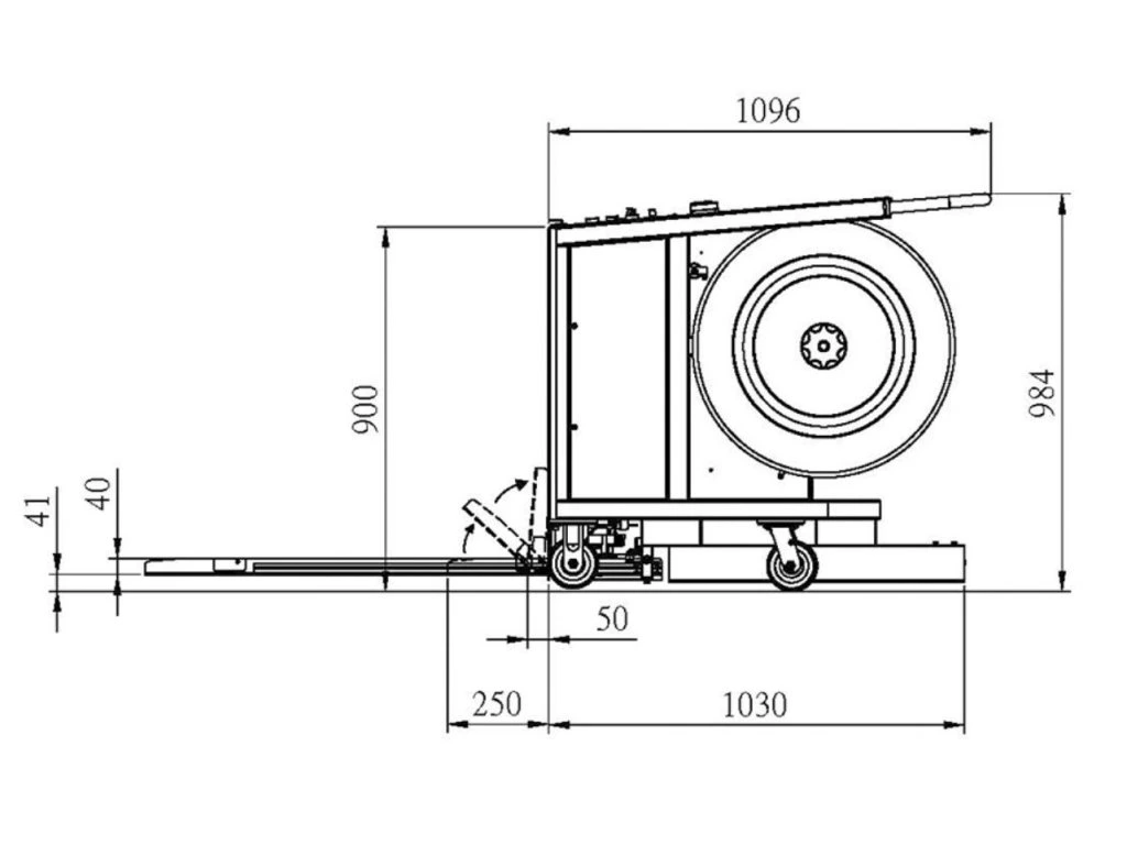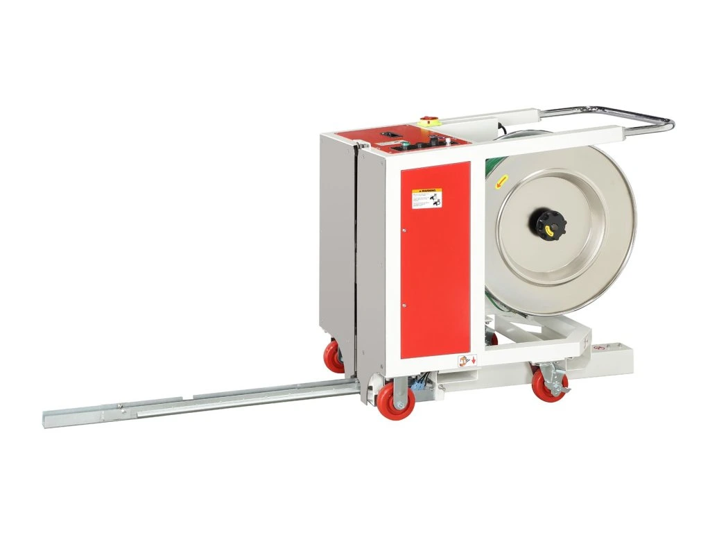 Stroj stačí jednoducho pristaviť k palete – nie je nutné ju presúvať na špeciálne pracovisko. Vďaka výsuvnému bajonetu sa páska automaticky prestrčí pod paletou, čo výrazne zrýchľuje celý proces a znižuje fyzickú záťaž pre obsluhu.