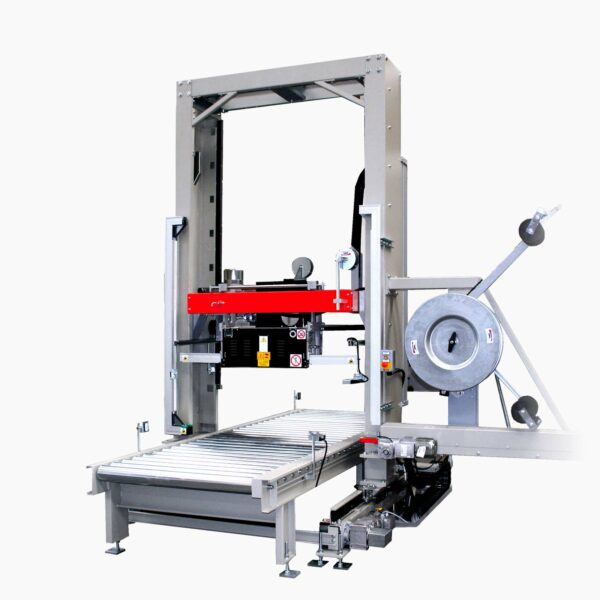 Páskovacia hlava je umiestnená horizontálne z bočnej časti stroja, horizontálny rám schádza okolo palety do nastavených úrovní, kde prevedie požadované páskovanie.