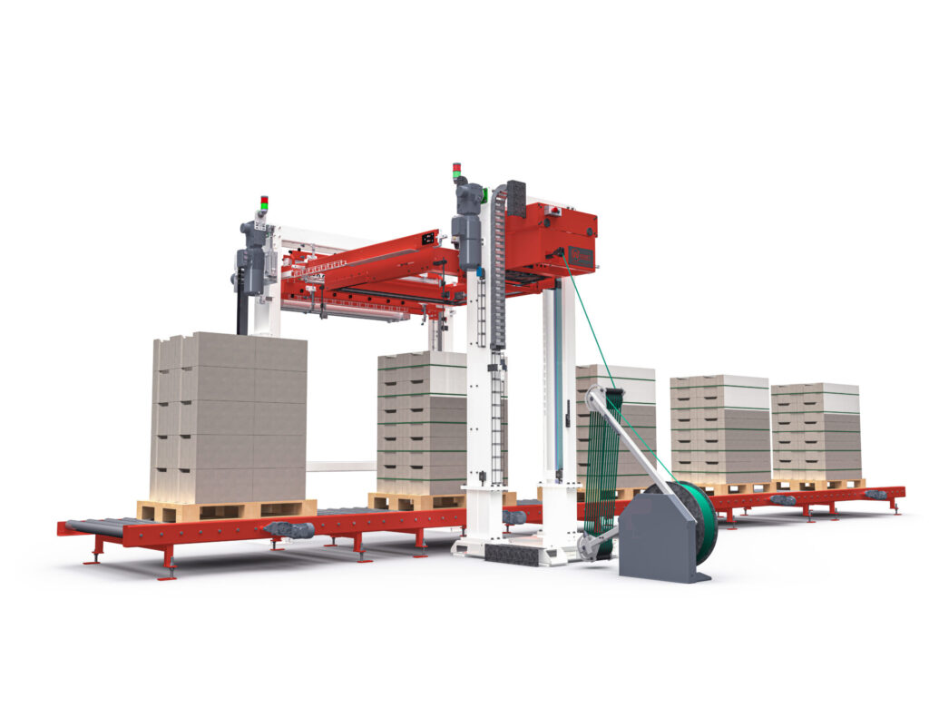 - automatické horizontálne páskovanie paletizovaného tovaru